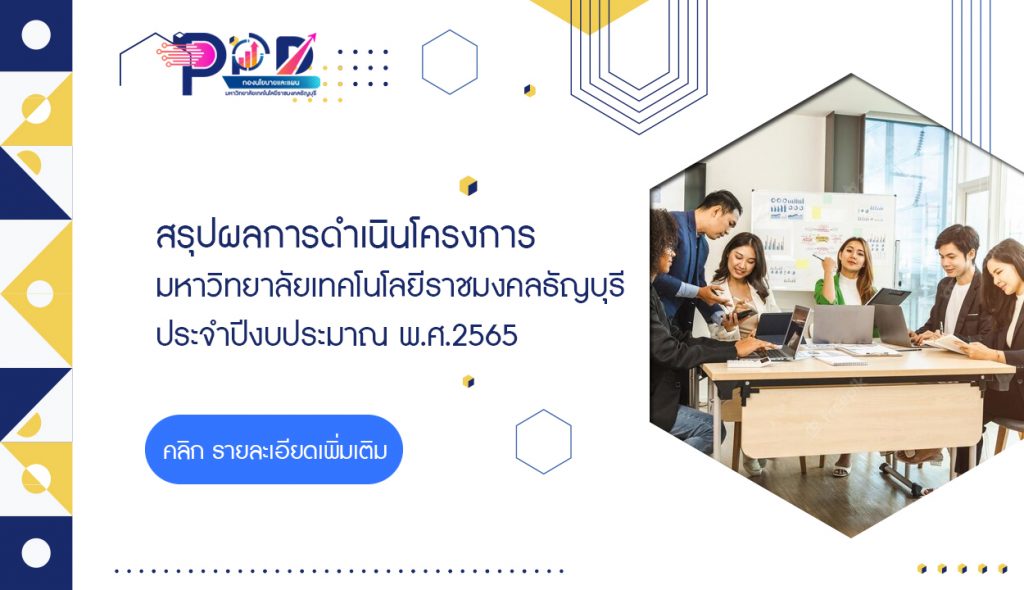 ธันวาคม 15, 2022Published by สุภภักดิ์ รักษ์แก้ว on ธันวาคม 15, 2022สรุปผลการดำเนินโครงการ มหาวิทยาลัยเทคโนโลยีราชมงคลธัญบุรี ประจำปีงบประมาณ พ.ศ.2565