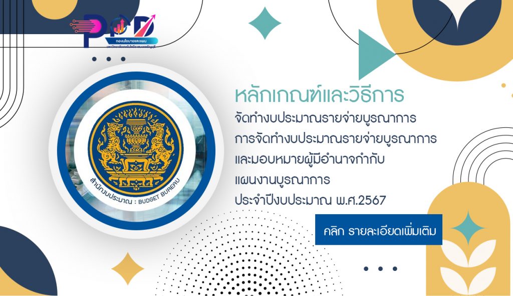 กันยายน 14, 2023Published by สุภภักดิ์ รักษ์แก้ว on กันยายน 14, 2023หลักเกณฑ์และวิธีการจัดทำงบประมาณรายจ่ายบูรณาการ การจัดทำงบประมาณรายจ่ายบูรณาการและมอบหมายผู้มีอำนาจกำกับแผนงานบูรณาการ ประจำปีงบประมาณ พ.ศ.2567